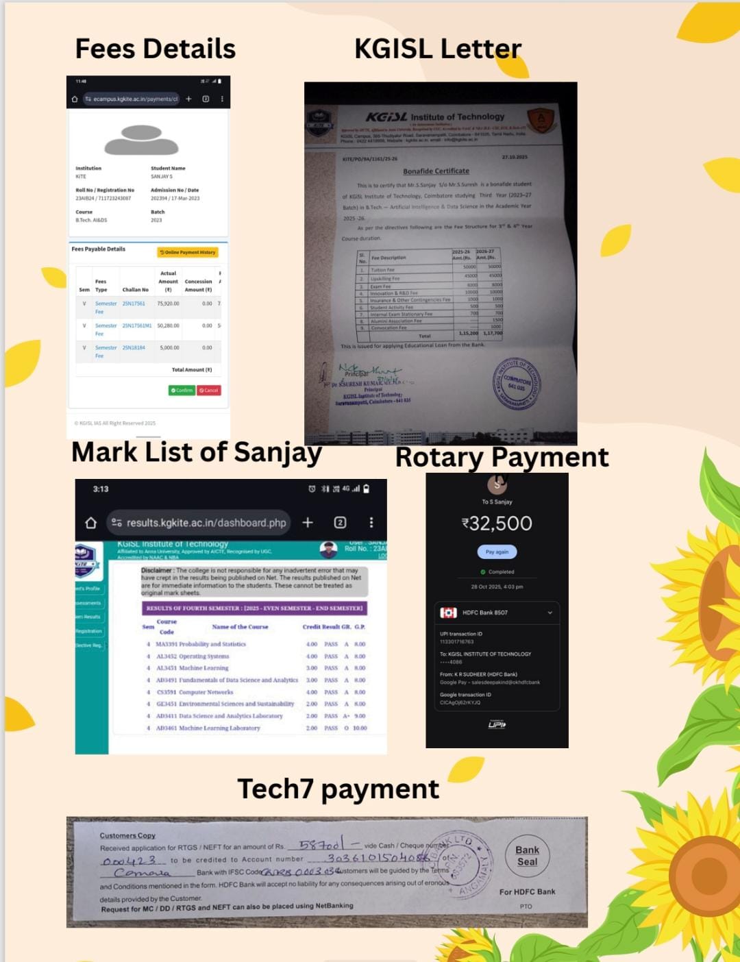 RCC Unicorns extended semester fee support to Master Sanjay, a B.Tech Artificial Intelligence student at KGISL Institute. With his mother working as a tailor and father as a security guard, the family faced financial constraints. Spearheaded by Rtn. PHF Manoj Pathakara, a collective contribution from Tech7, RCC Unicorns, and Nurbs Lab enabled financial assistance of ₹1,11,200, ensuring continuity in his education.
